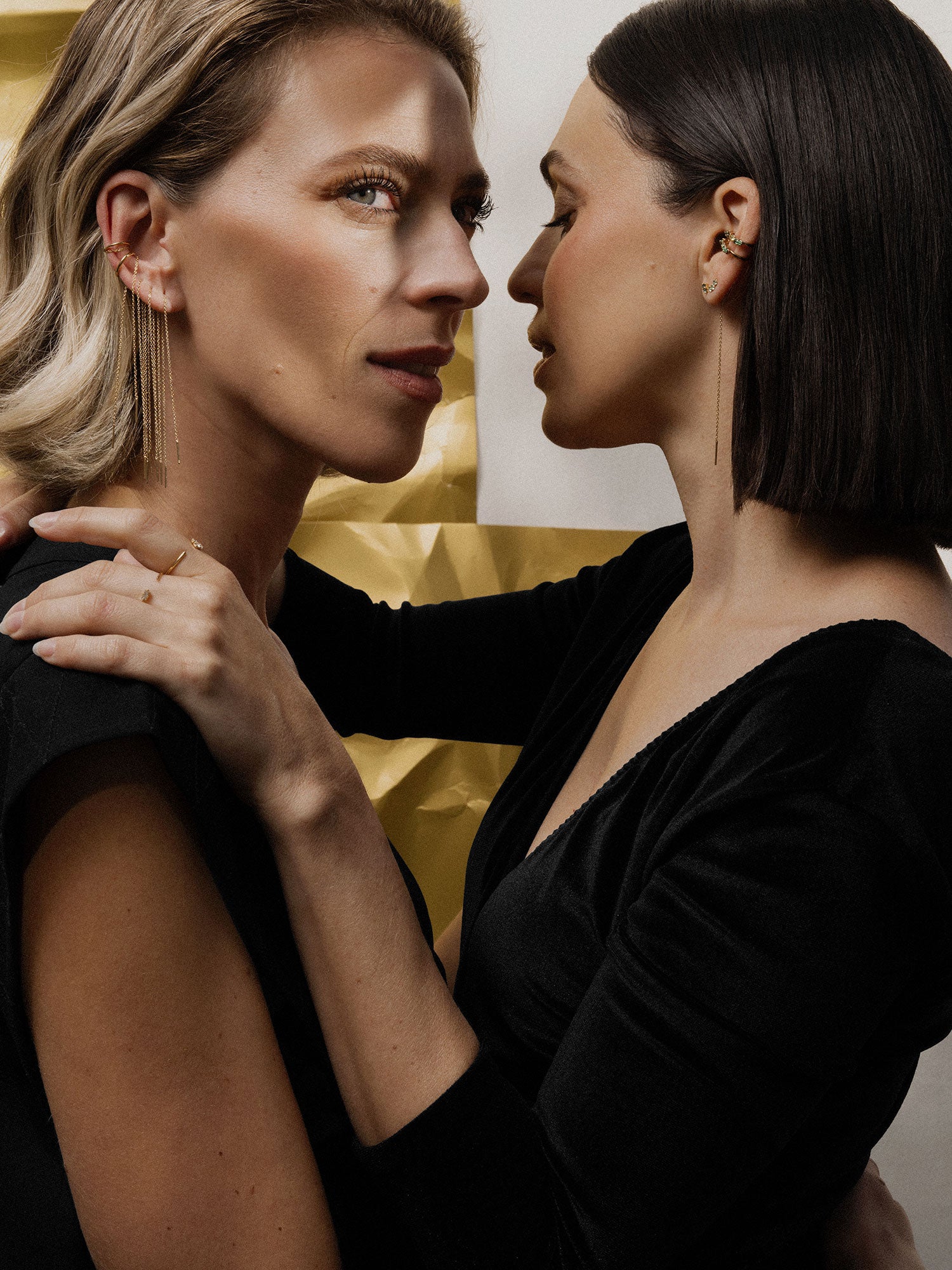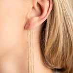 👉🏻 Dans deux trous ou plus : en le passant dans deux ou trois piercings du lobe, par l’avant ou l’arrière de l’oreille, il crée des drapés de chaînes de différentes longueurs pour un effet plus travaillé. Il peut également s’utiliser de manière asymétrique, en fixant une des chaînes dans un piercing hélix.