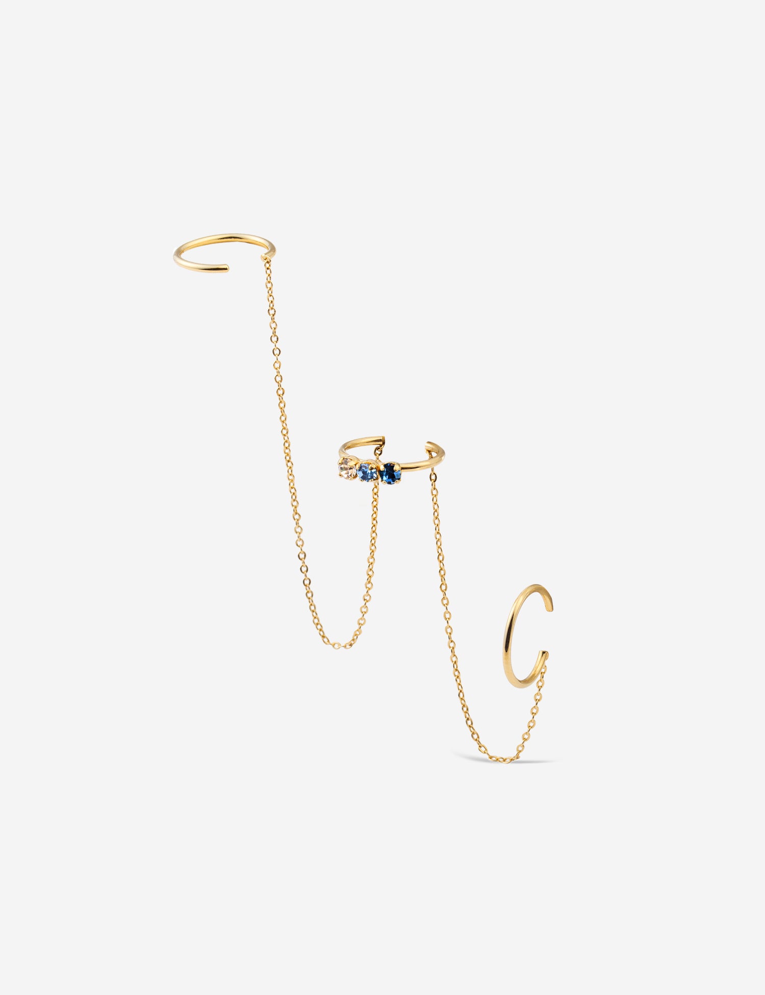 L’équilibre passe aussi parfois par le déséquilibre. Un chemin d’oreille à gauche sera ultra féminin porté avec une boucle pendante à droite. On ne se prive pas non plus de porter un bracelet, un collier ou une bague pour accompagner sa boucle grimpante. Notre décolleté, nos poignets et nos doigts ne sont pas obligés de pâtir d’un bijou charismatique porté à l’oreille.