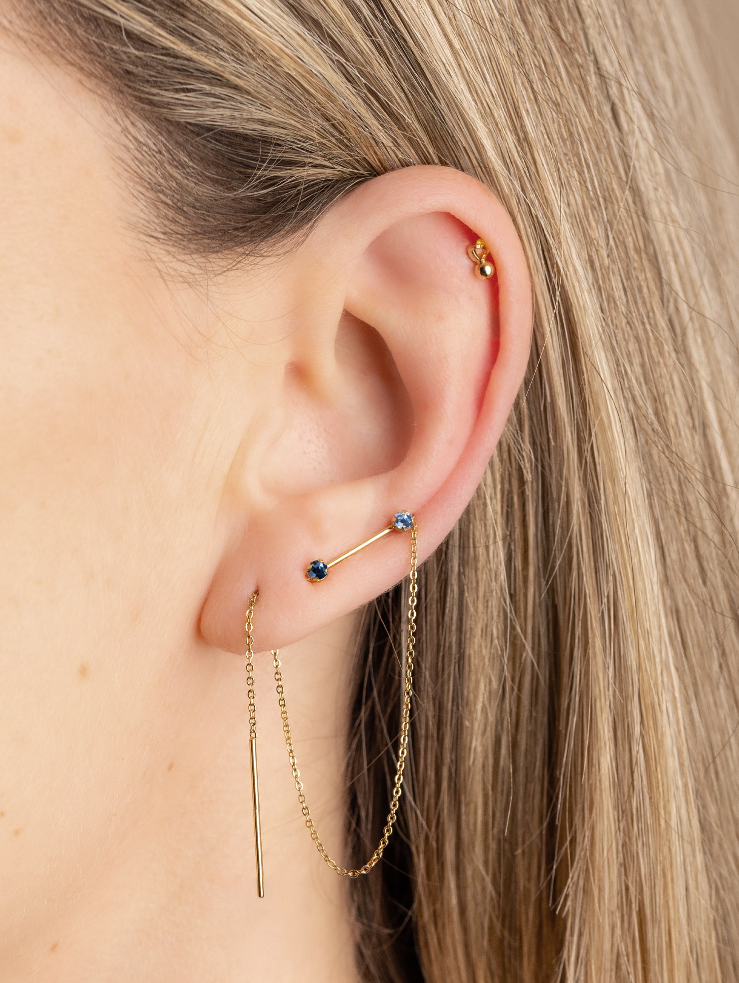 Boucle d’oreille chaîne dorée avec deux pierres bleues