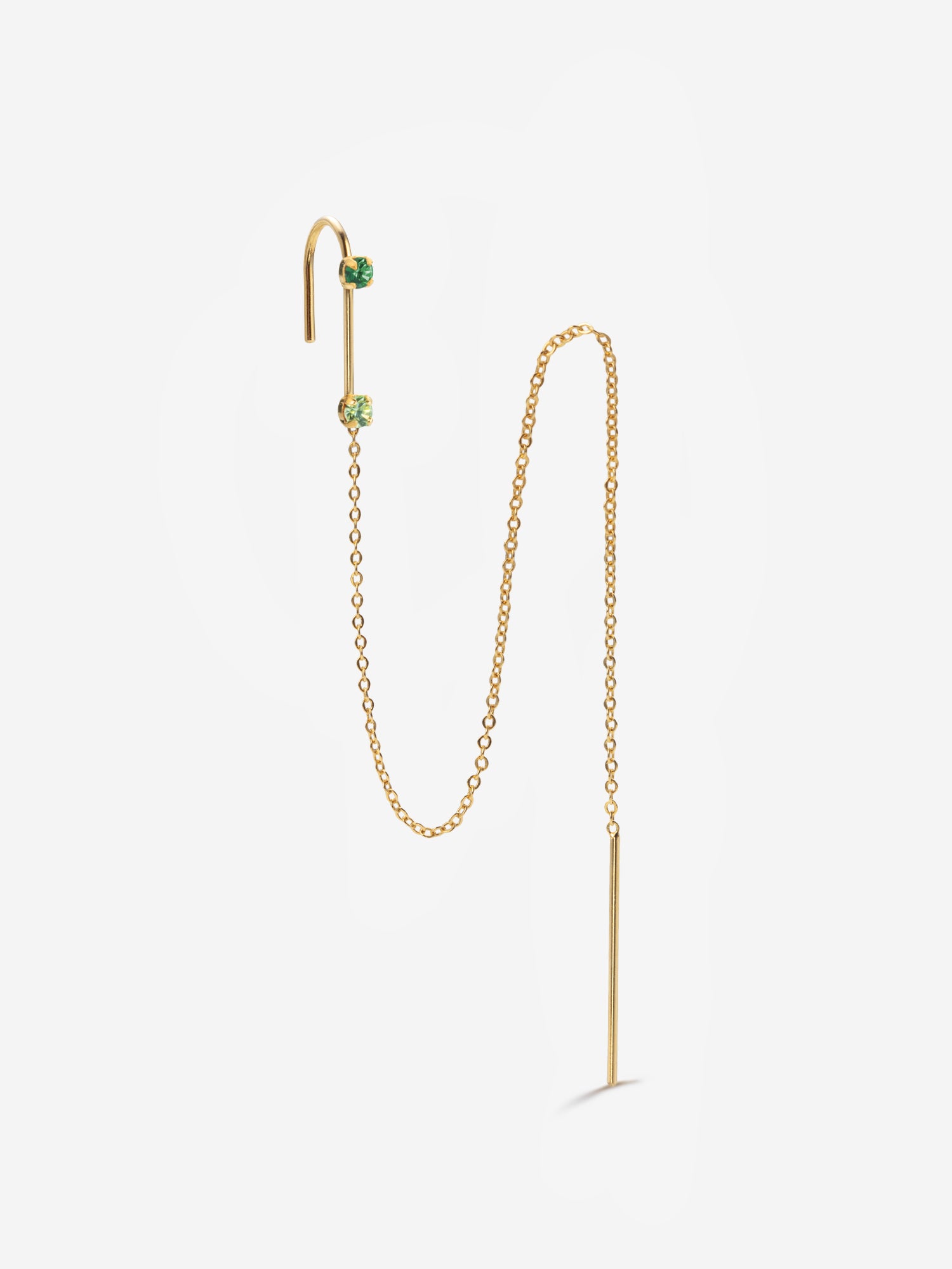 Découvrez la boucle d'oreille dorée Prosper. Composée d'une chaîne fine et de pierres émeraude et chrysolite, ce bijou modulable se plie à vos envies. Sa chaîne délicate peut se glisser dans un seul trou pour un effet subtil ou traverser plusieurs piercings pour créer un jeu de volumes et de mouvements. Le jonc habille aussi votre lobe s’il est remonté et offre ainsi un autre visage à ce bijou femme.